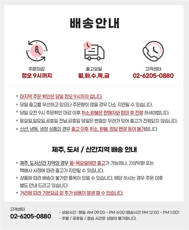 · 배송은 입금확인된 날짜로부터 1~3일 소요되며 최대 7일 이내 제공됩니다. ( 공휴일, 기상악화, 상품 손질 등 불가피한 상황에 따라 추가 지연될 수 있습니다.)