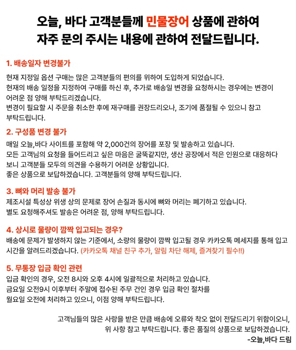 · 배송은 입금확인된 날짜로부터 1~3일 소요되며 최대 7일 이내 제공됩니다. ( 공휴일, 기상악화, 상품 손질 등 불가피한 상황에 따라 추가 지연될 수 있습니다.)